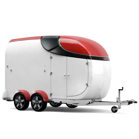 Kahden hevosen traileri, täysin lasikuituinen (polyester) rakenne. Tyylikäs ja aerodynaaminen muotoilu.